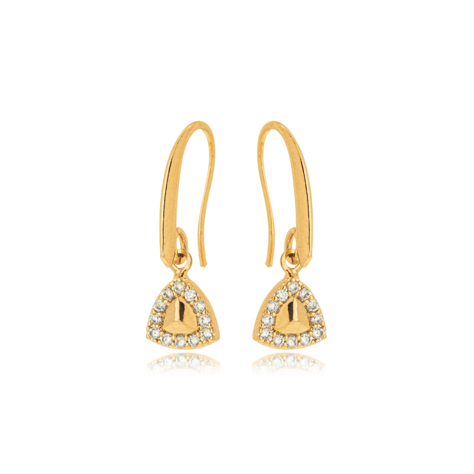 Formato triangular com linhas suaves, acabamento polido e zircônias cristal cravadas ao redor, criando um contraste elegante entre brilho e geometria.