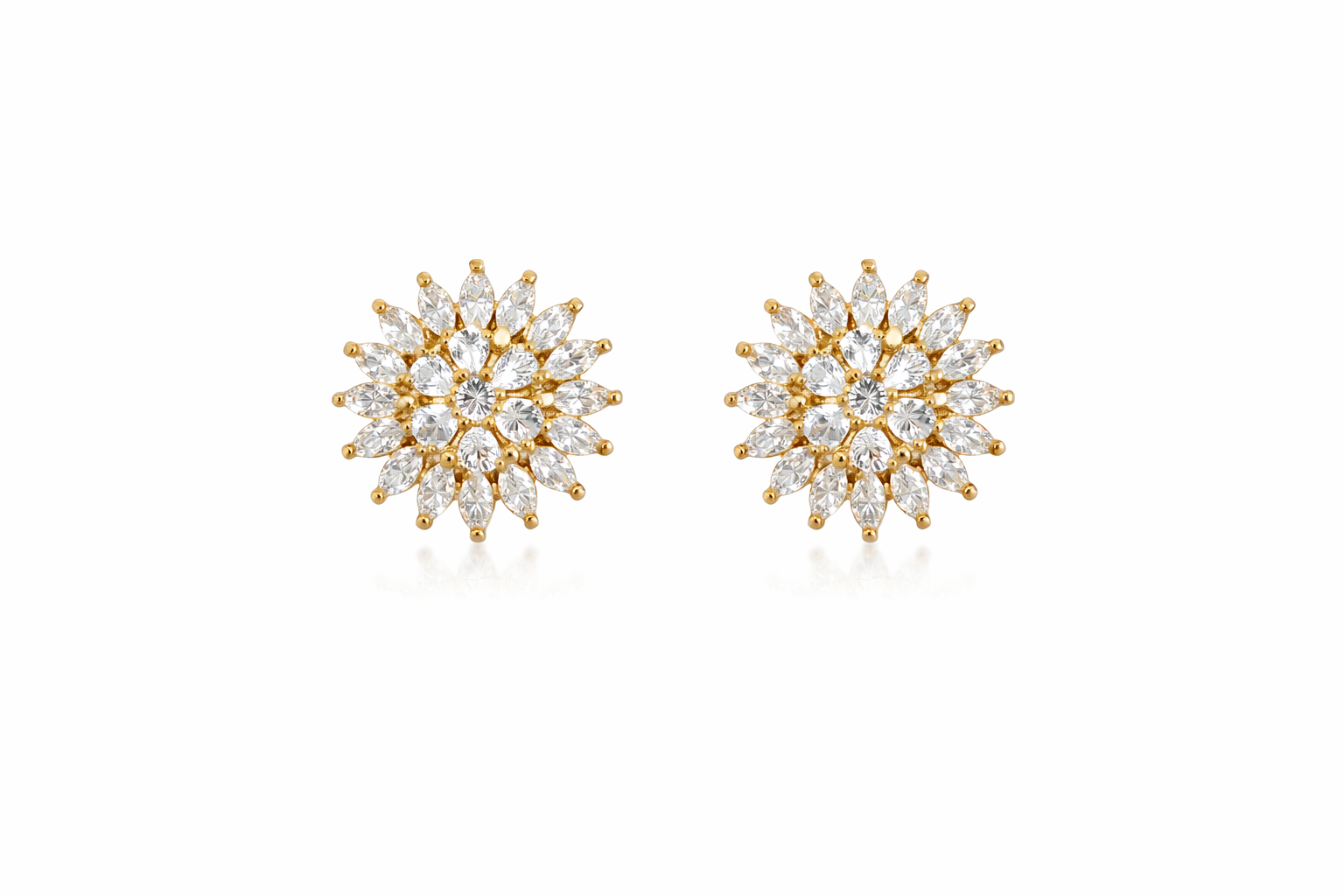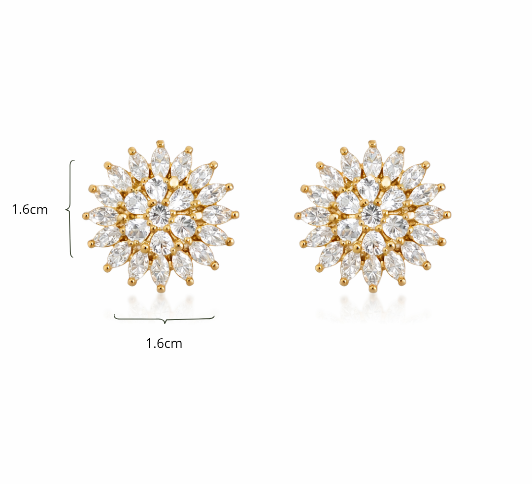 Inspirado na delicadeza das flores, o design apresenta pétalas totalmente cravejadas que refletem a luz de maneira sofisticada. A composição harmoniosa entre o dourado do banho e o brilho das pedras cria uma joia luxuosa, elegante e atemporal.