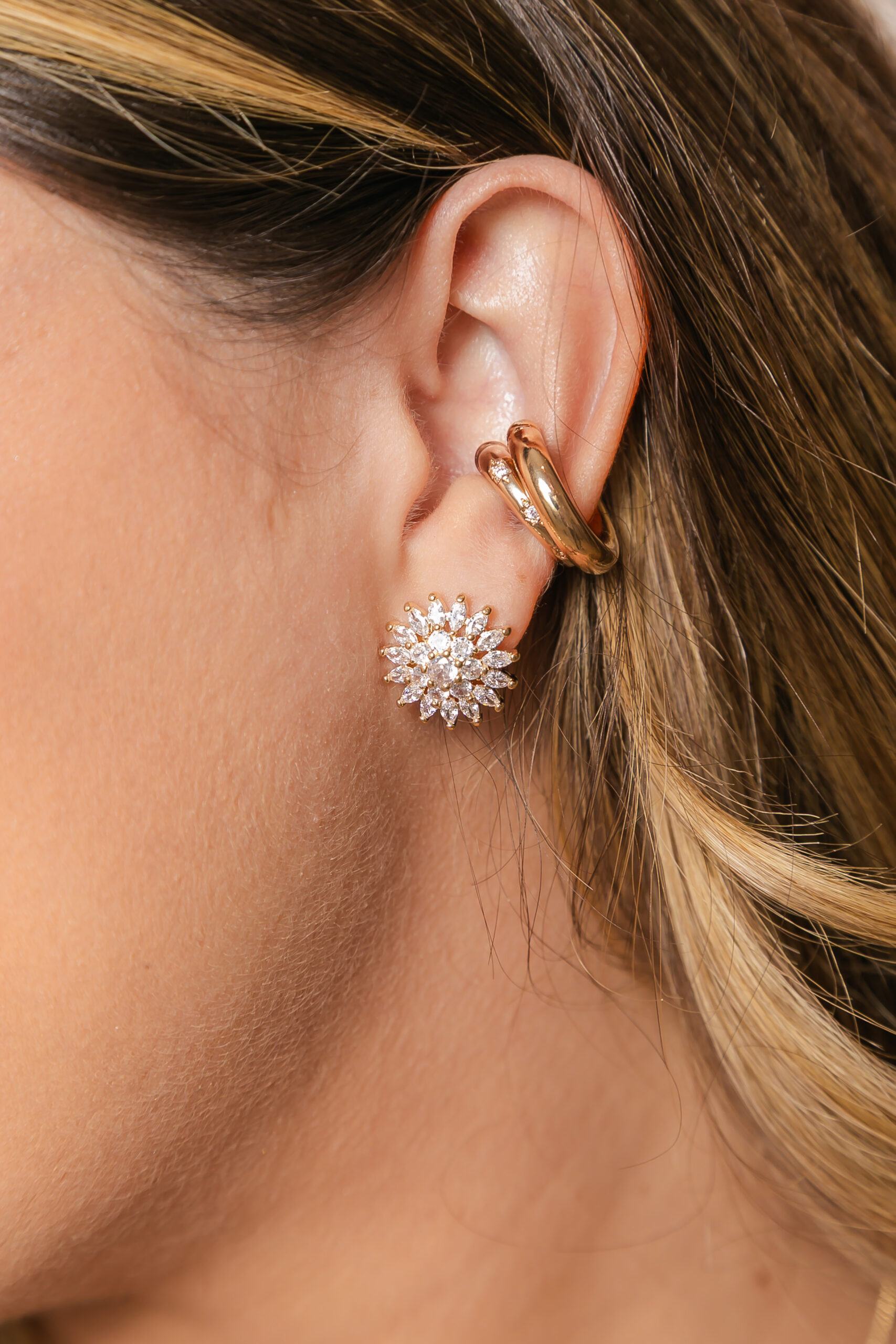 Banhado a ouro 18k, o brinco combina acabamento impecável com riqueza de detalhes, sendo perfeito para eventos especiais, ocasiões noturnas ou produções que pedem destaque e glamour.