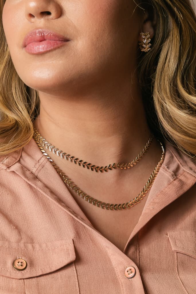 Foto da modelo meramente ilustrativa, não acompanha demais peças. A Choker Folhinhas está fazendo composição com o Colar Folhinhas (mais longo).