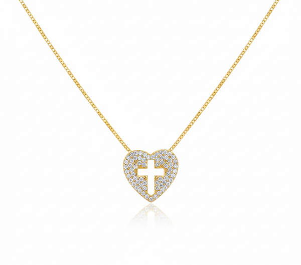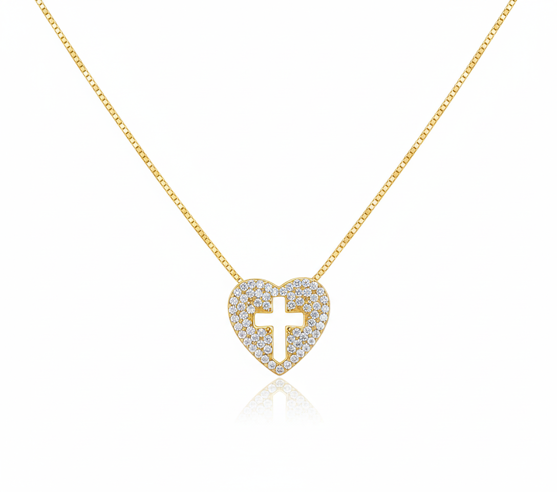 Com um design atemporal e minimalista, o coração de linhas suaves envolve a cruz vazada de forma harmoniosa, criando uma peça leve, elegante e simbólica. Uma joia versátil, que combina perfeitamente com diferentes estilos e pode ser usada sozinha ou em mix de colares.