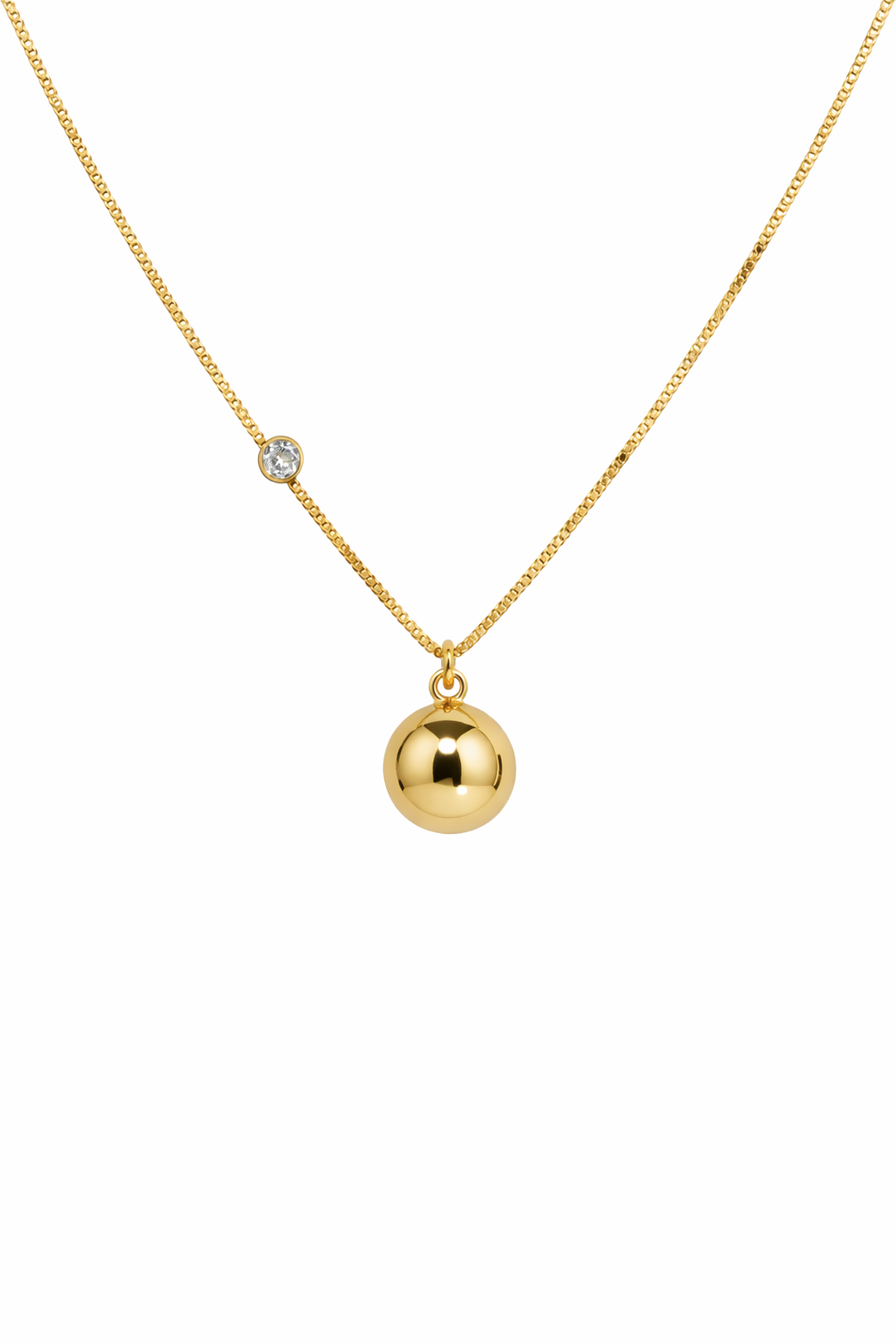 O Colar com Esfera e Ponto de Luz Fixo combina delicadeza e sofisticação em uma composição moderna e elegante. O pingente de esfera traz equilíbrio ao design, enquanto o ponto de luz fixo no centro da corrente adiciona um toque sutil de brilho, criando um visual refinado e harmonioso.