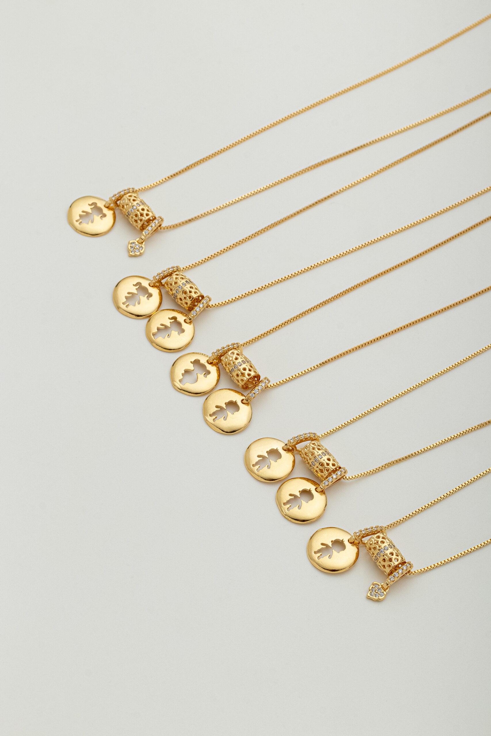 O design combina elementos clássicos e contemporâneos: a medalha traz um toque atemporal, enquanto os detalhes cravejados e o pequeno coração adicionam brilho e delicadeza à composição.