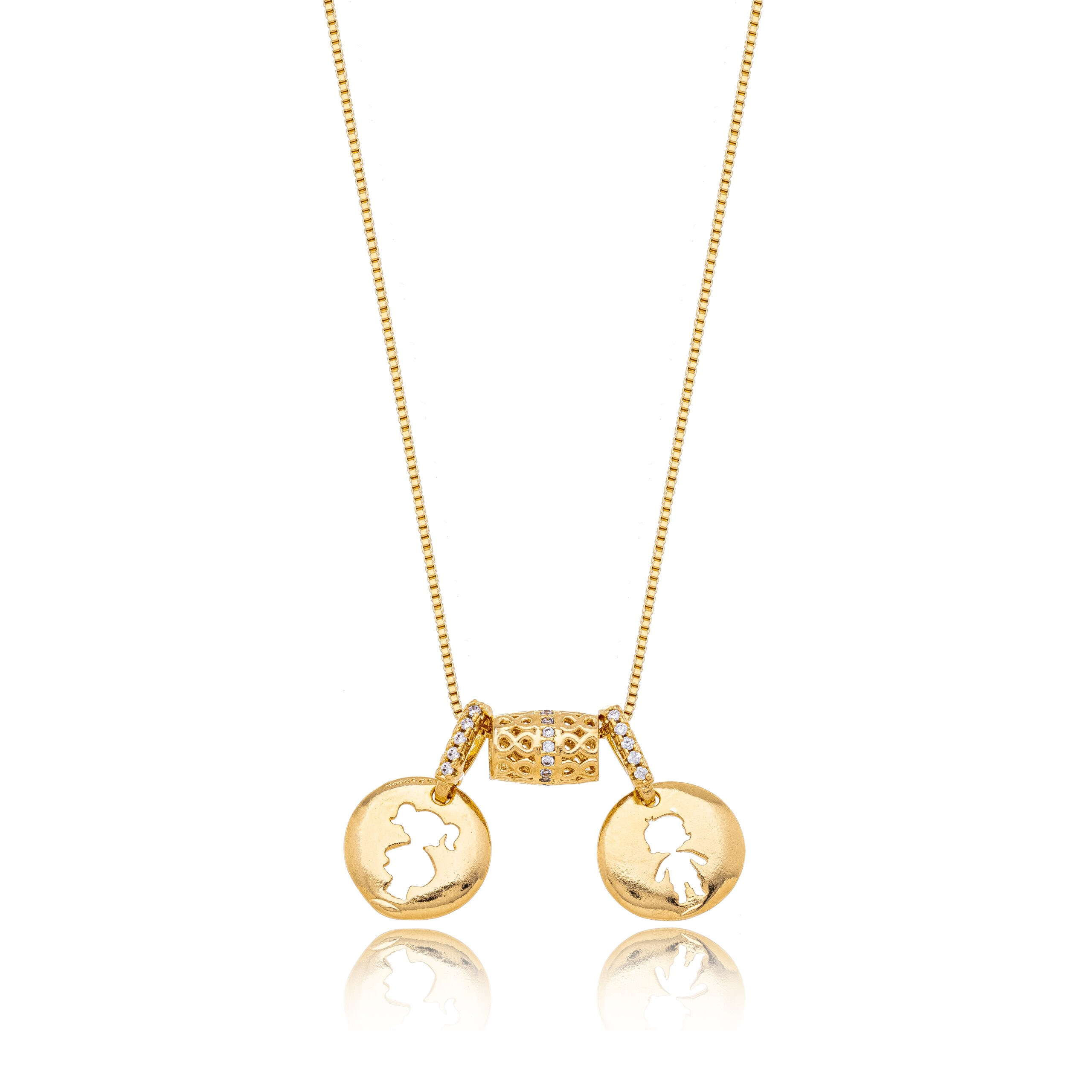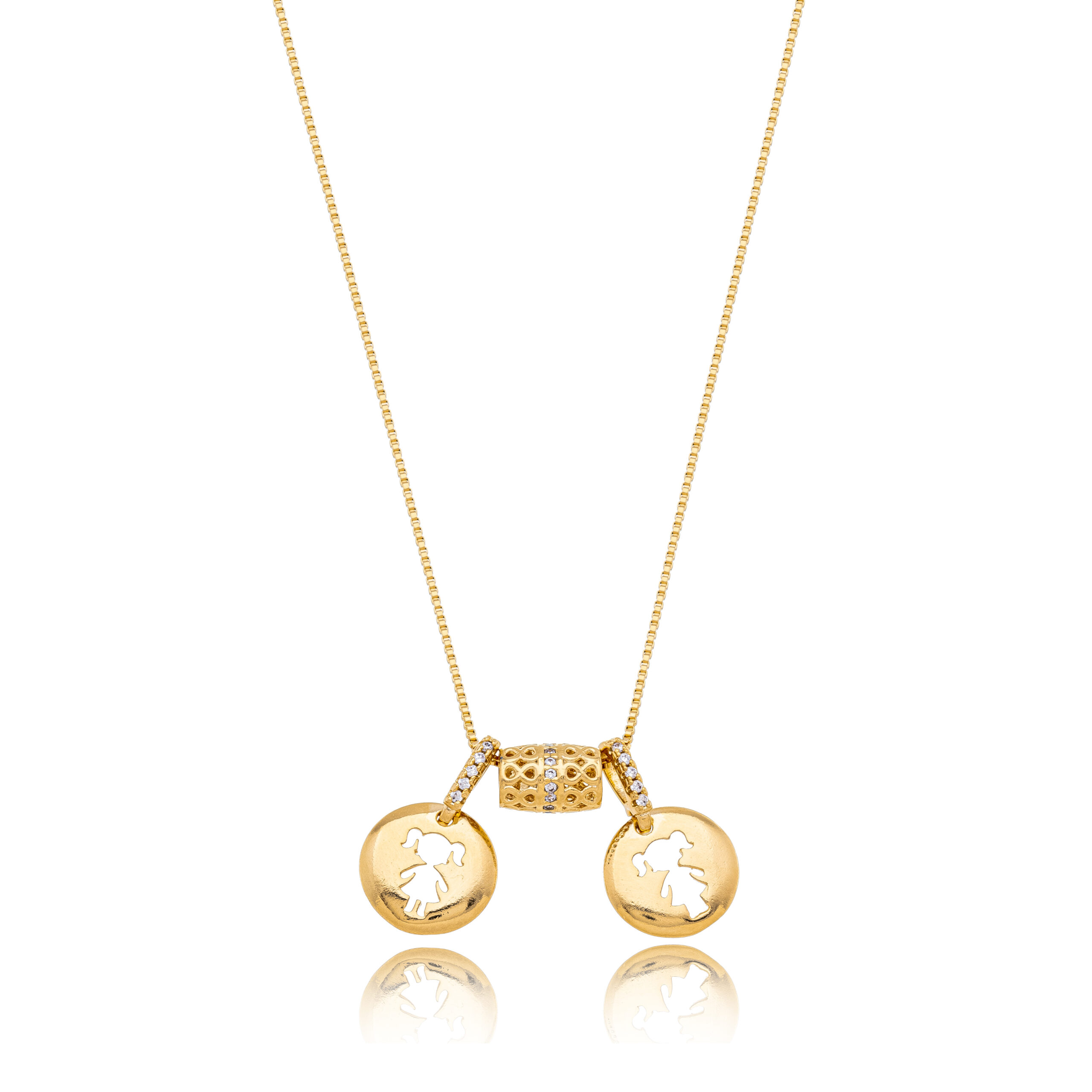 O Colar Filhos Medalha e Coração é uma Semijoia delicada e cheia de significado, perfeita para eternizar o amor entre mãe e filhos. Composto por uma medalha com a silhueta de criança, um detalhe central cravejado e um pequeno coração com brilho, a peça representa carinho, proteção e conexão eterna.