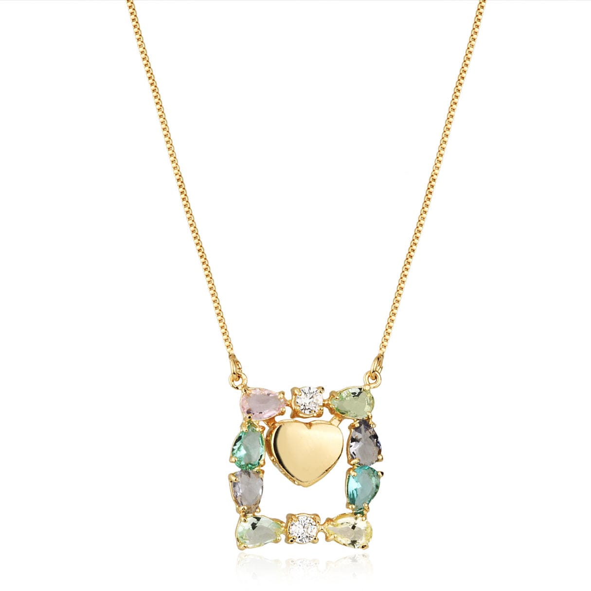 O design traz uma moldura quadrada feita de zircônias coloridas, que cercam um coração central delicado. A mistura de cores e formas cria uma peça alegre, sofisticada e cheia de personalidade.
