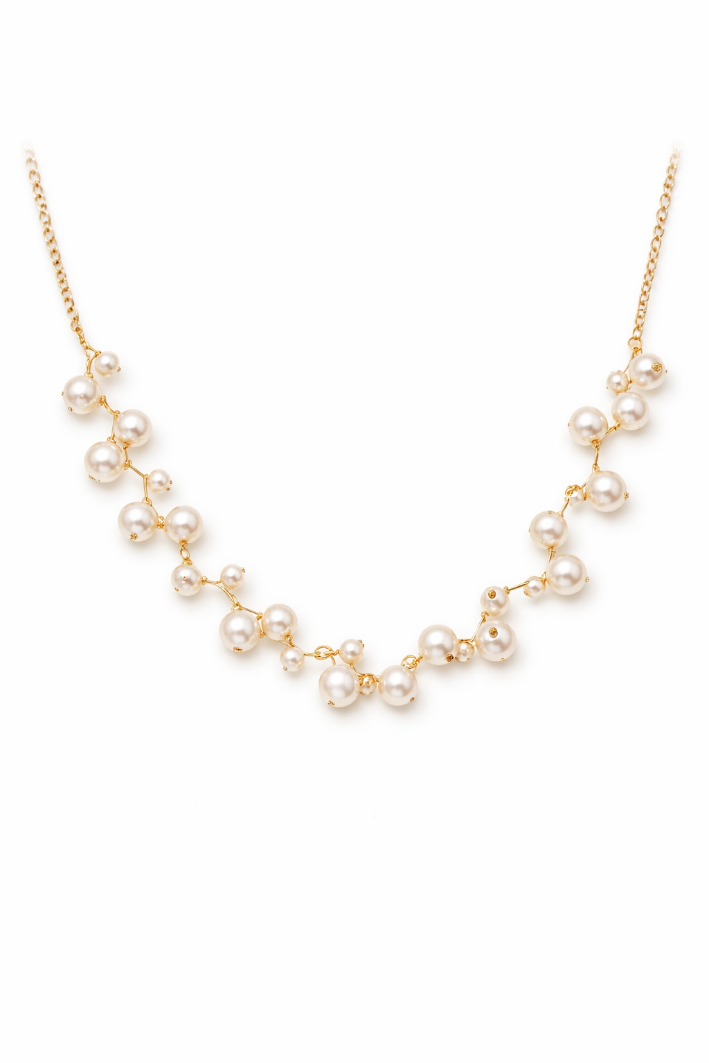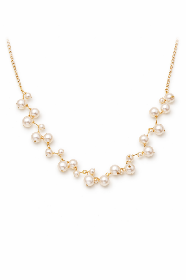 Com estrutura em zigzag, o colar é delicadamente adornado por pérolas que acompanham o traçado da peça, criando um visual harmônico, feminino e refinado.
