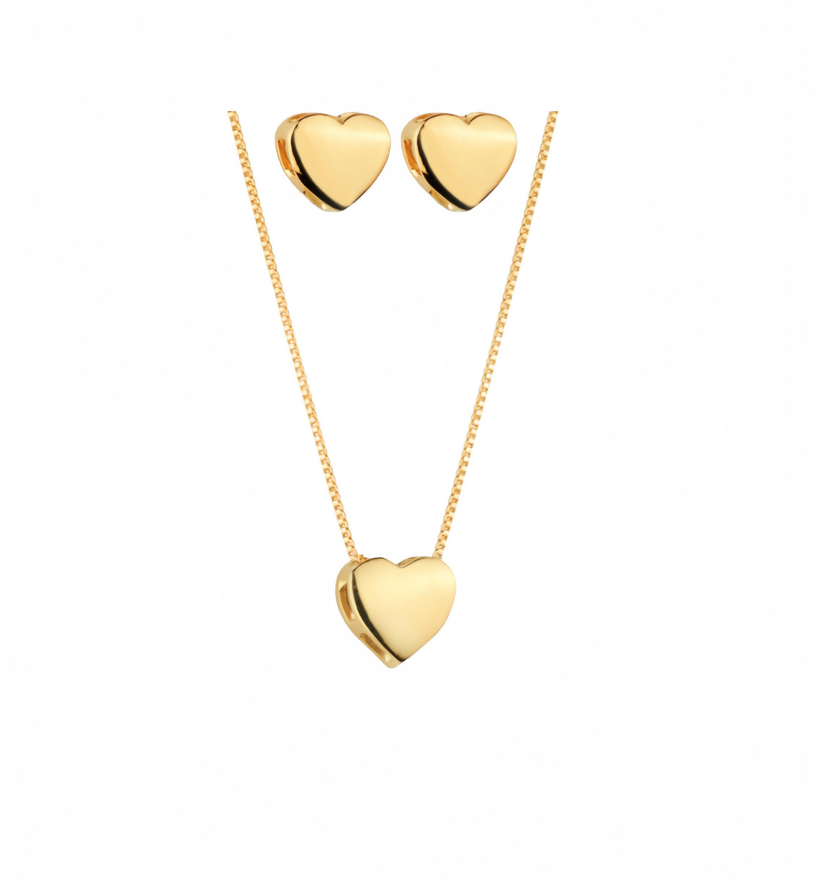 Design clean e contemporâneo, com pingente e brincos em formato de coração liso e acabamento espelhado. O colar de 45 cm oferece caimento elegante e versátil.