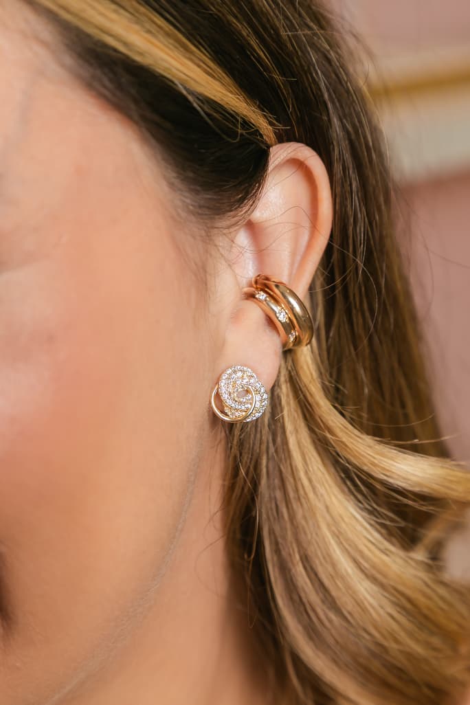 Seu design é marcado por um elegante formato de nozinho, com curvas envolventes que trazem modernidade e fluidez à peça. A cravação minuciosa acrescenta brilho refinado, enquanto o acabamento em ouro 18K realça a luminosidade e o caráter luxuoso do conjunto. Brinco e pingente seguem exatamente o mesmo desenho, criando perfeita harmonia visual.