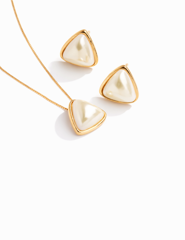 O Conjunto Triângulo Pérola é a união perfeita entre modernidade e delicadeza. Com design geométrico em formato triangular e destaque para a pérola central, a peça transmite sofisticação com um toque contemporâneo.