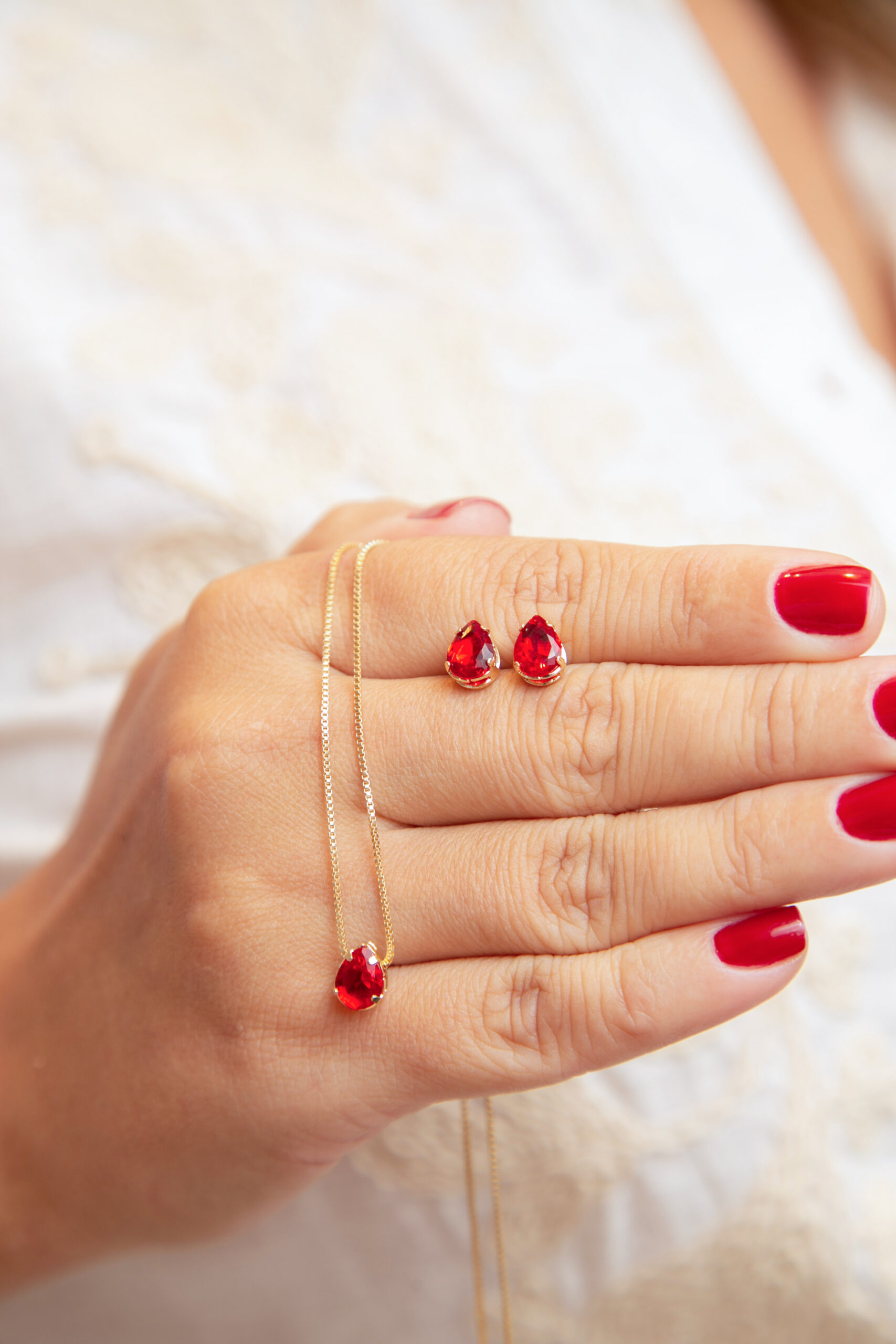 O Conjunto Rubi Gota é a expressão perfeita de elegância e sofisticação. Composto por brinco e colar com pedra em tom rubi no delicado formato de gota, a peça traz um toque de cor intenso e apaixonante, ideal para destacar o visual com classe.
