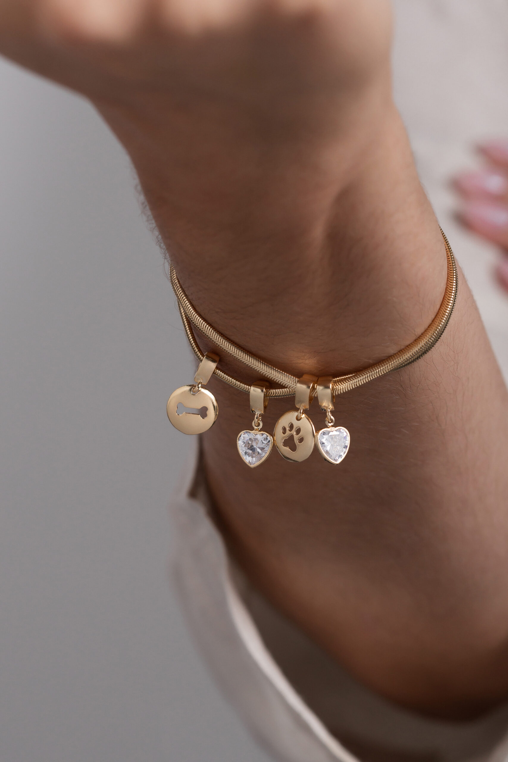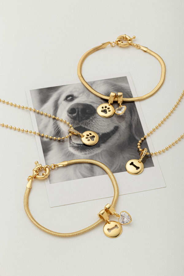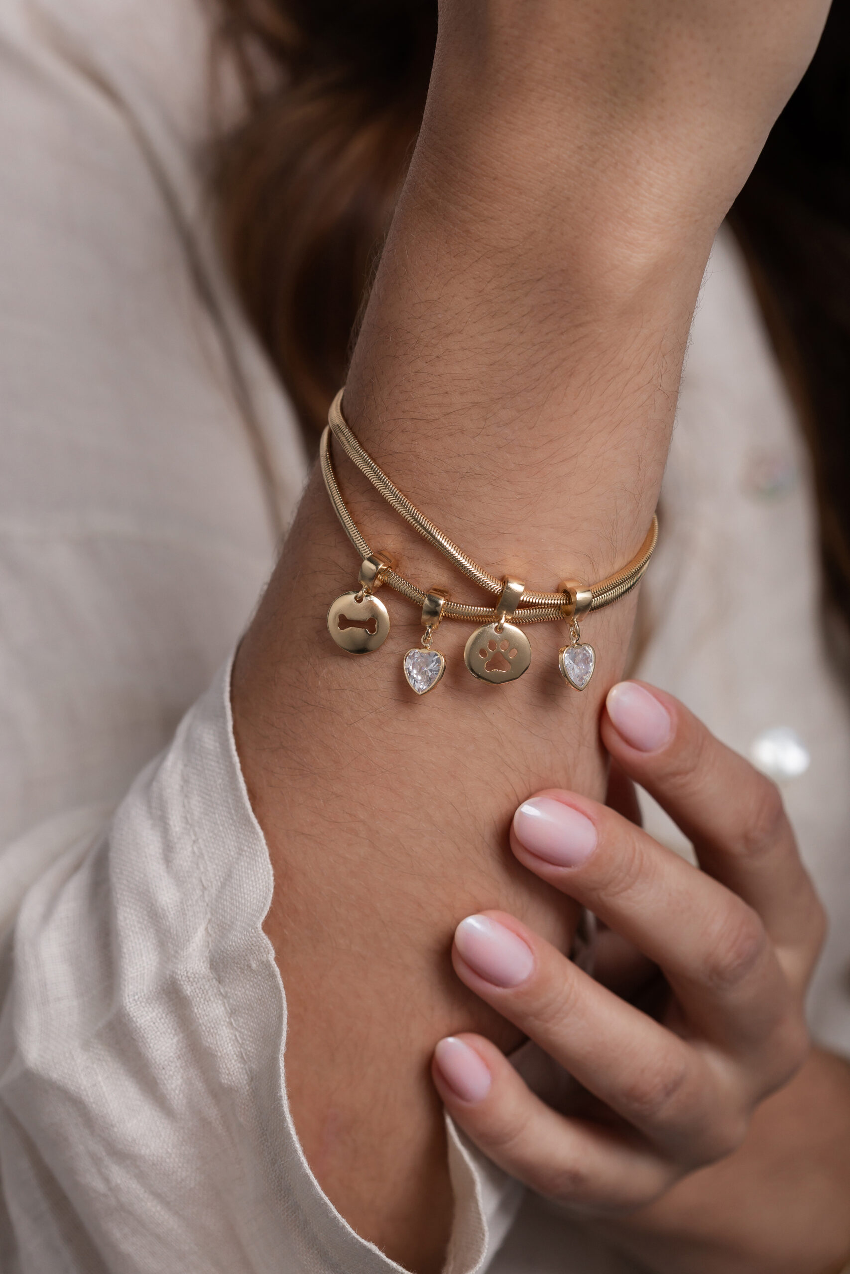 Com design elegante e atemporal, a pulseira possui pingentes inspirados no universo pet — podendo ser de patinha ou ossinho — representando carinho, lealdade e conexão verdadeira.